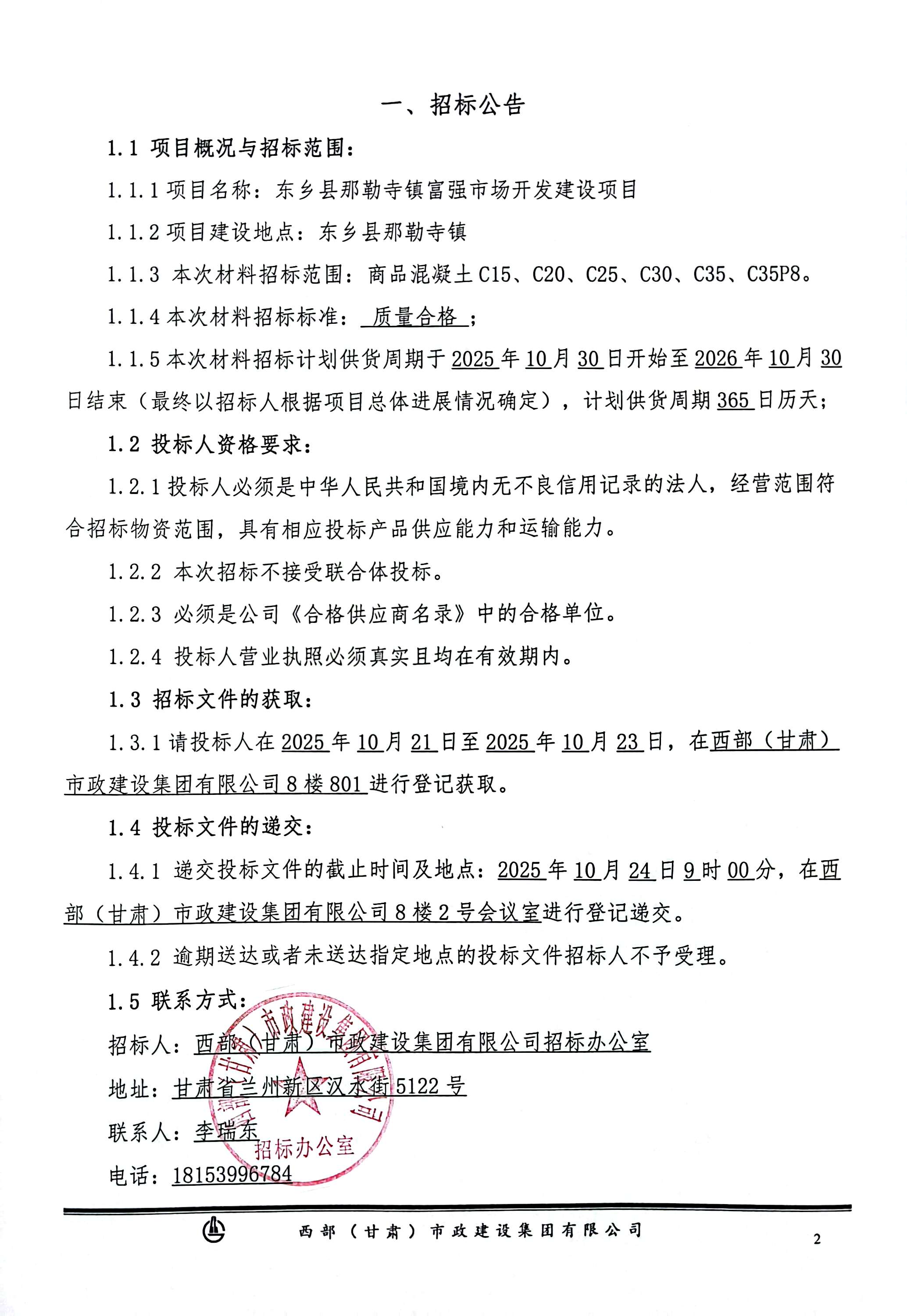 东乡县那勒寺镇富强市场开发建设项目-商品混凝土-招标公告