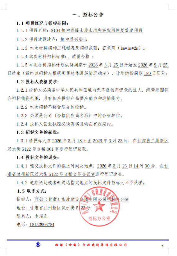 S104榆中兴隆山段山洪灾害灾后恢复重建项目-石笼材料招标公告
