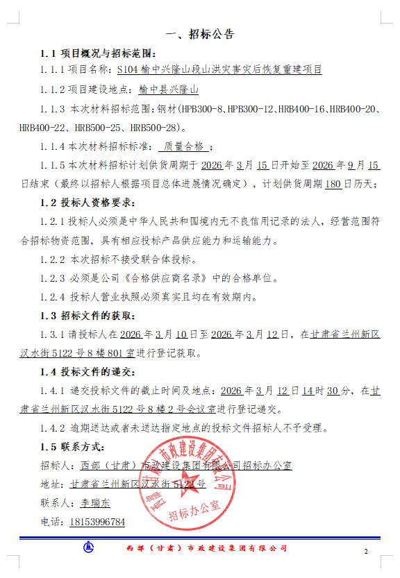 S104榆中兴隆山段山洪灾害灾后恢复重建项目施工-钢材招标公告