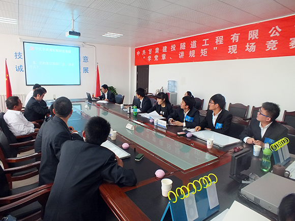 5月22日上午,甘肃建投隧道公司举行“学党章、讲规矩”现场知识竞赛活动,公司领导班子、管理人员和全体党员参加了此次活动。开展此次活动,一方面是对公司全体党员学习党章效果的检验,另一方面是借助本次竞赛将“学党章、讲规矩”活动进一步推向深入,同时也是贯彻落实集团总公司“学党章、讲规矩”活动的精神要求。通过知识竞赛,进一步激发全体党员、青年职工学习热情,落实公司建设学习型公司的战略部署,为集团总公司开展“学党章、讲规矩”知识竞赛做好准备,打好基础。