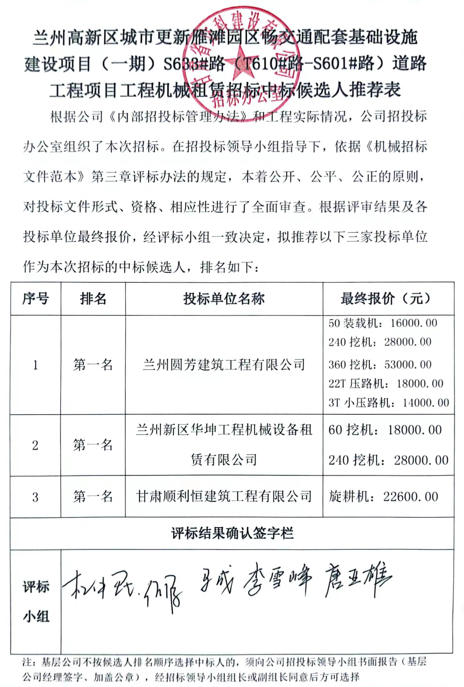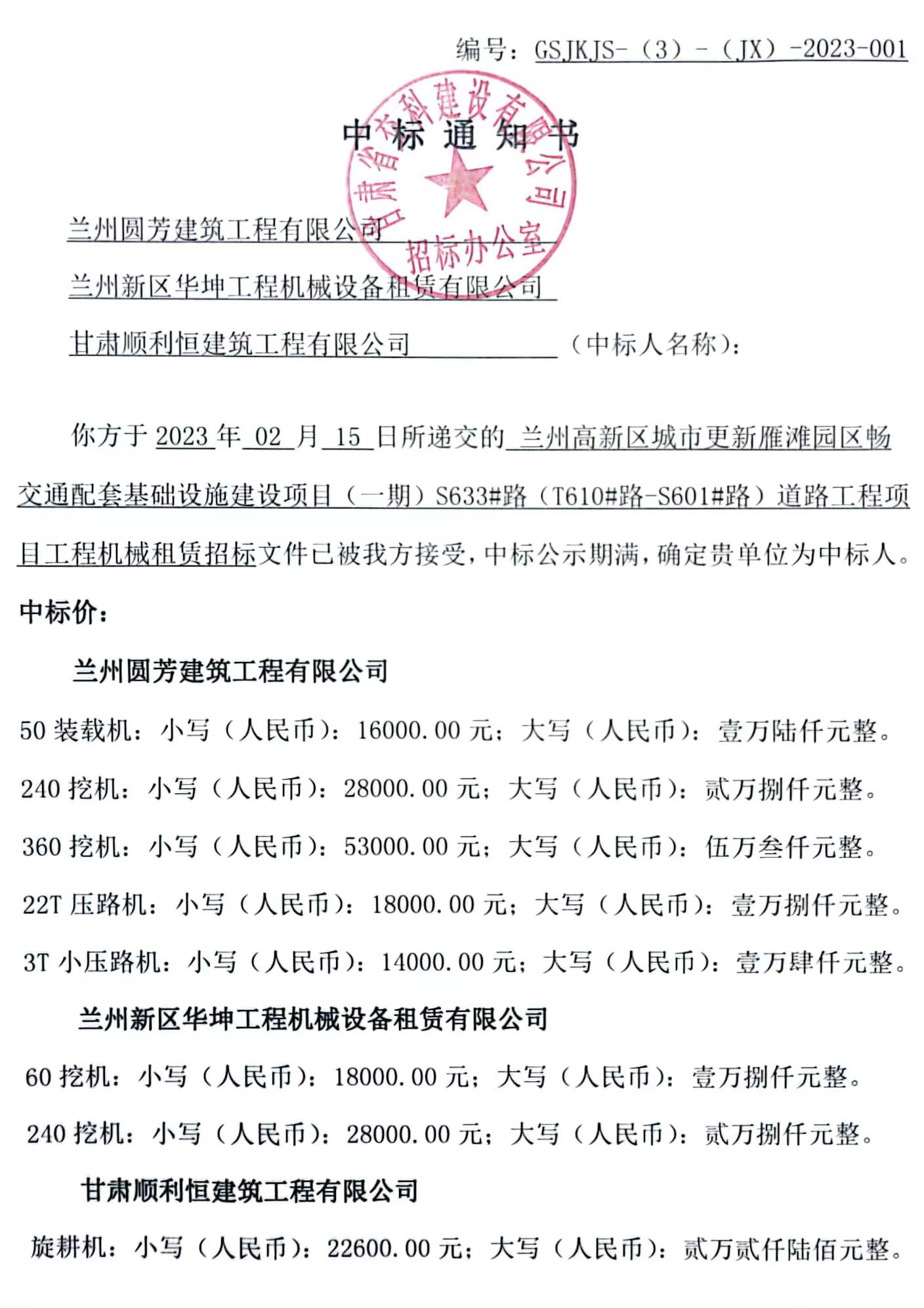 兰州高新区城市更新雁滩园区畅交通配套基础设施建设项目(一期)S633#路(T610#路-S601#路)道路工程项目工程机械租赁中标候选人及中标通知书
