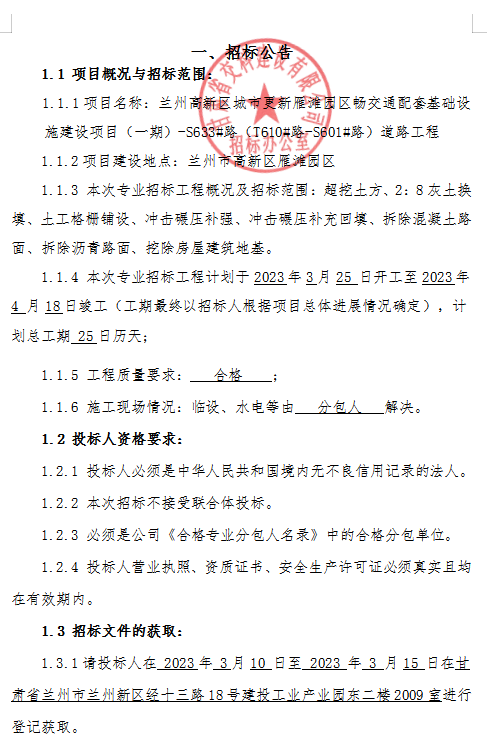 兰州高新城市更新雁滩园区畅交通配套基础设施建设项目(一期)-S633#路(T610#-S601#路)道路工程路基处理施工-招标公告