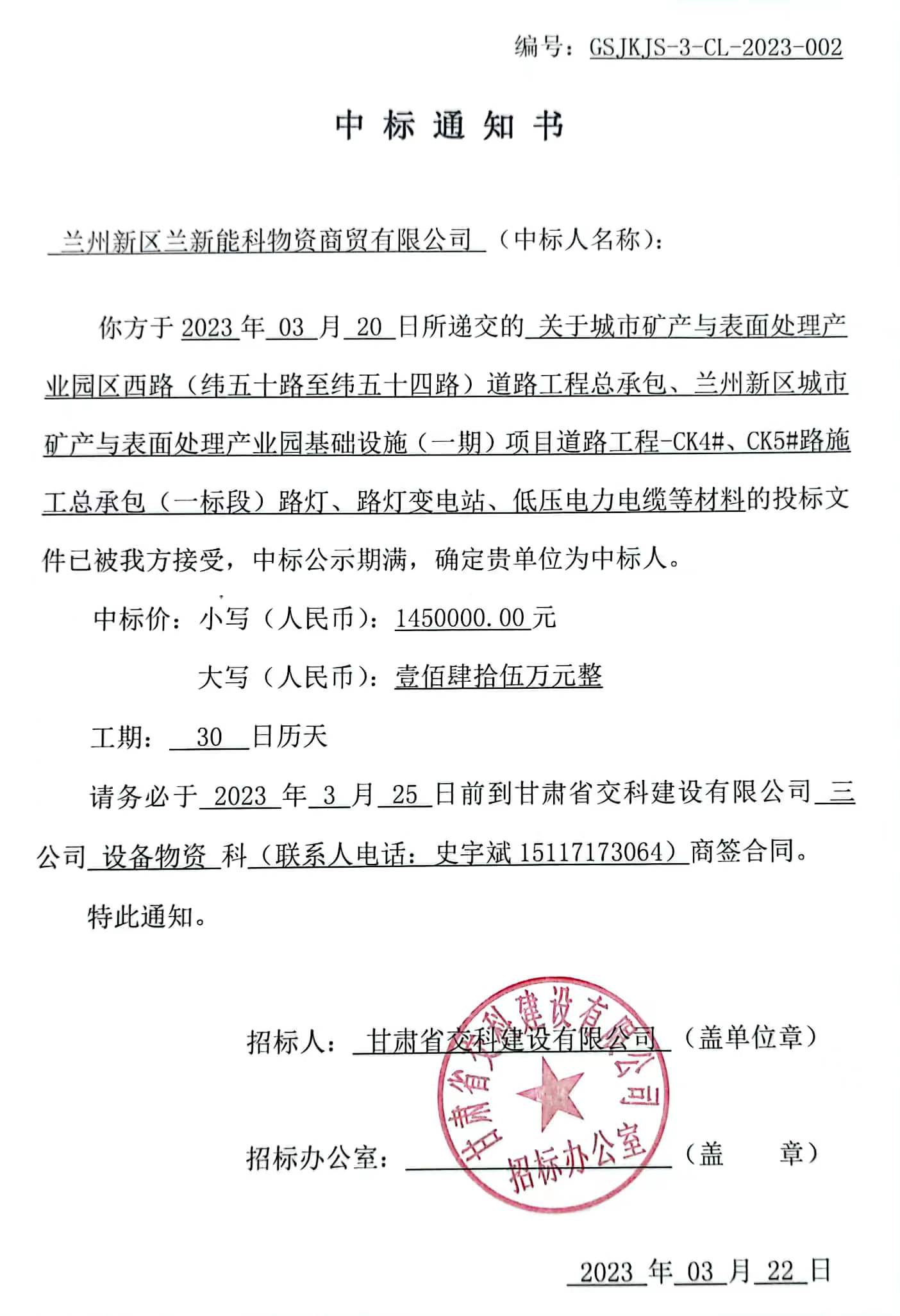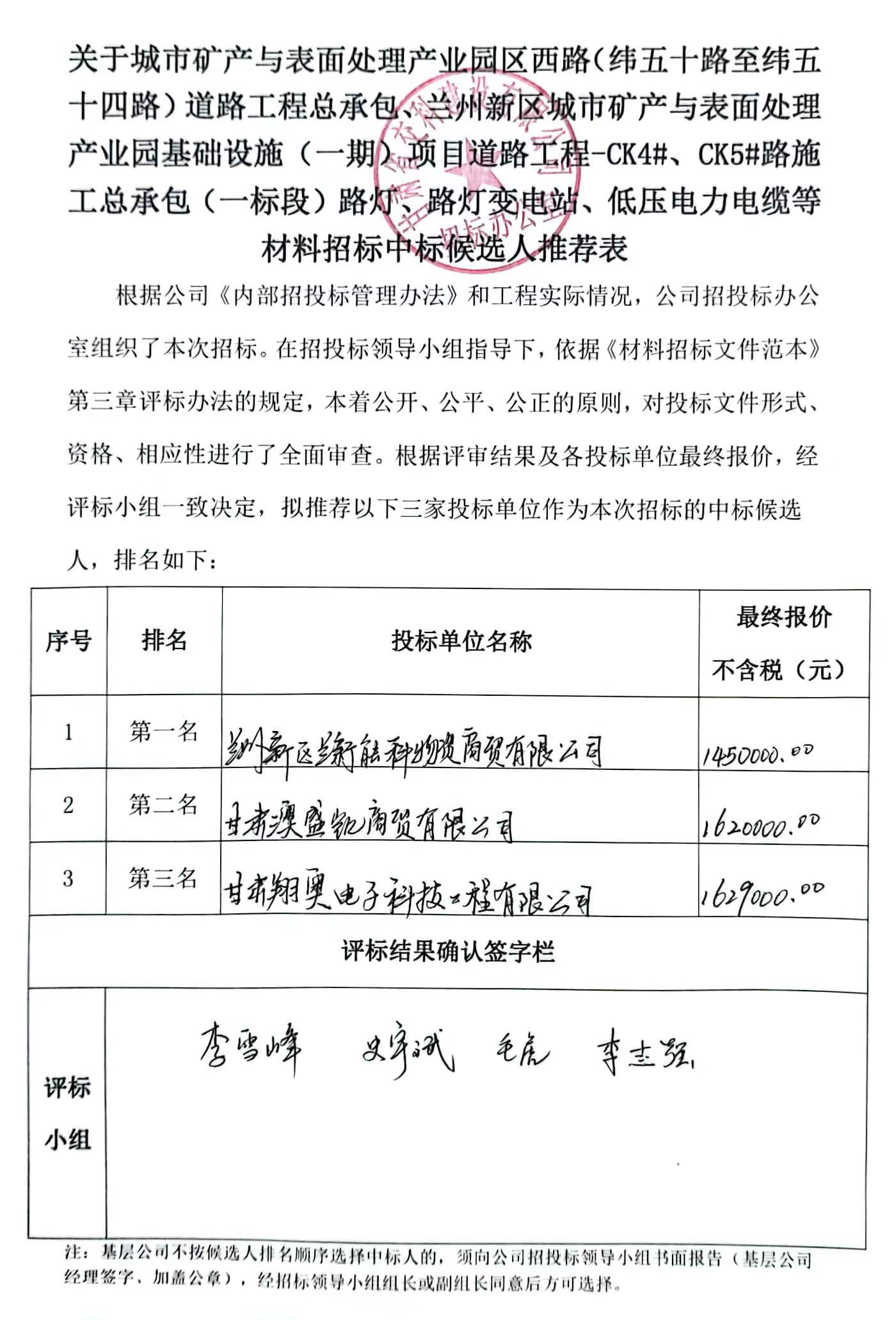 关于城市矿产与表面处理产业园区西路(纬五十路至纬五十四路)道路工程总承包、兰州新区城市矿产与表面处理产业园基础设施(一期)项目道路工程-ck4#、ck5#路施工总承包(一标段)路灯等材料招标中标候选人及中标通知书