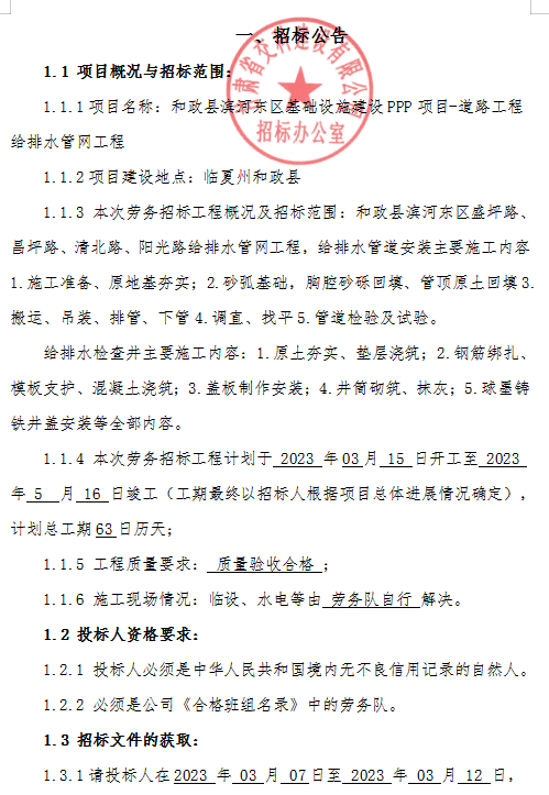 和政县滨河东区基础设施建设PPP项目-道路工程给排水管网工程-招标公告